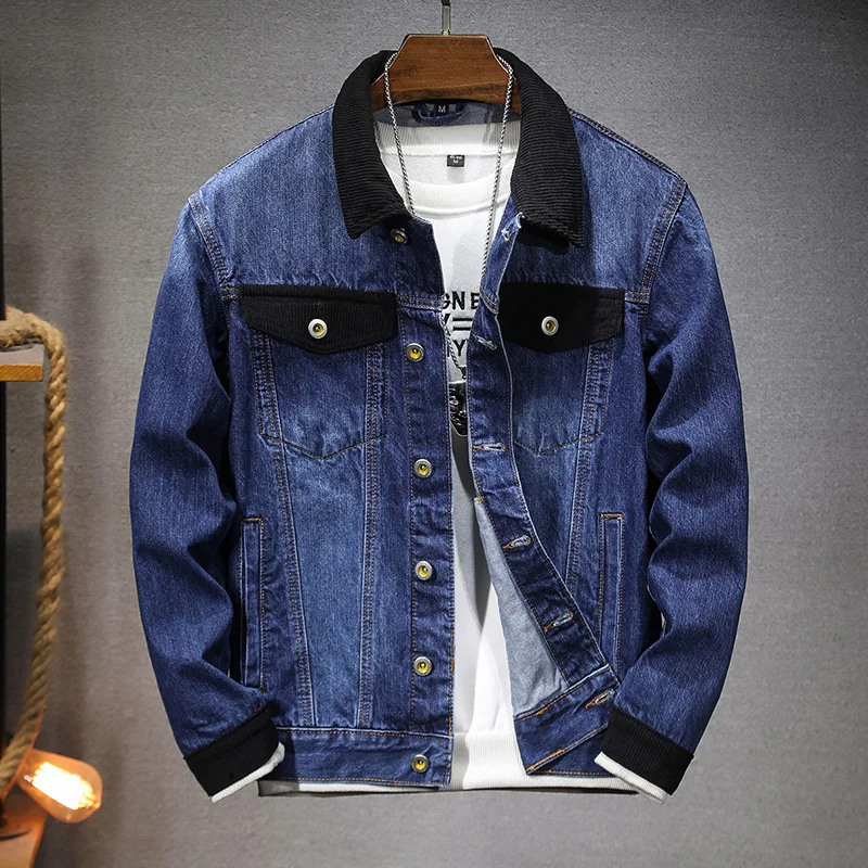2024 autumn and winter new products Men’s blue washed denim jacket Men’s stand collar corduroy patchwork jacket